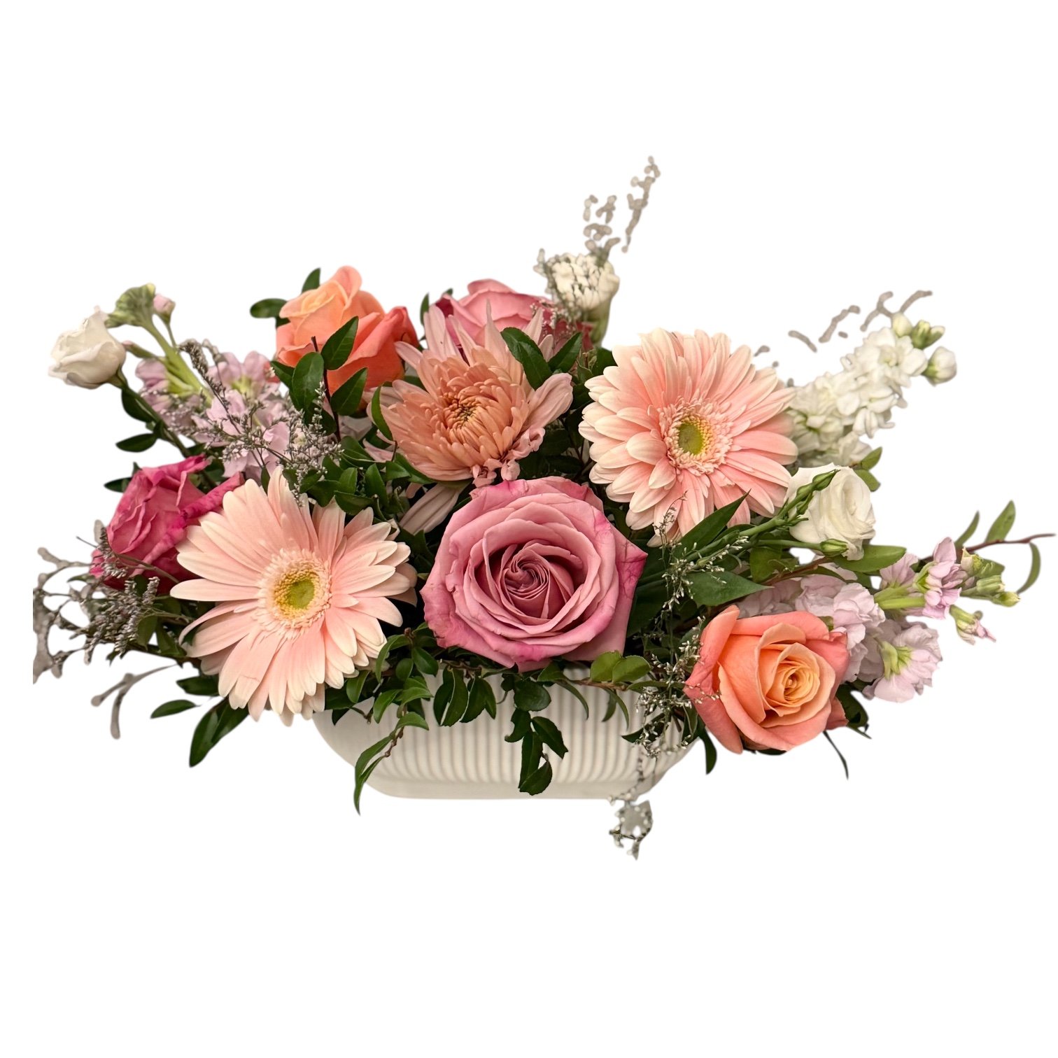 Pastel Spring arrangement in a low compote vase. A nice medium size to decorate your dining table featuring roses and gerberas. South Tampa delivery Friday April 3rd and Saturday April 4th.